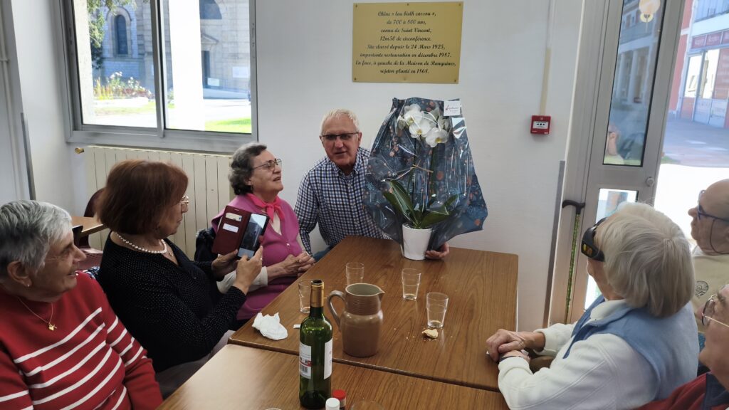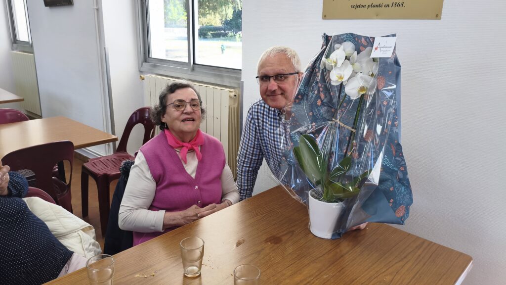 À la fin de ce repas notre président sortant Jean MORA a offert un bouquet de fleurs à Rosinette BERSET et à Bernadette RIGAUX MASSOU ainsi que 2 livres à Guy BERSET pour les remercier de leur implication dans le fonctionnement de la Fraternité Chrétienne des Personnes Malades et Handicapées des Landes.